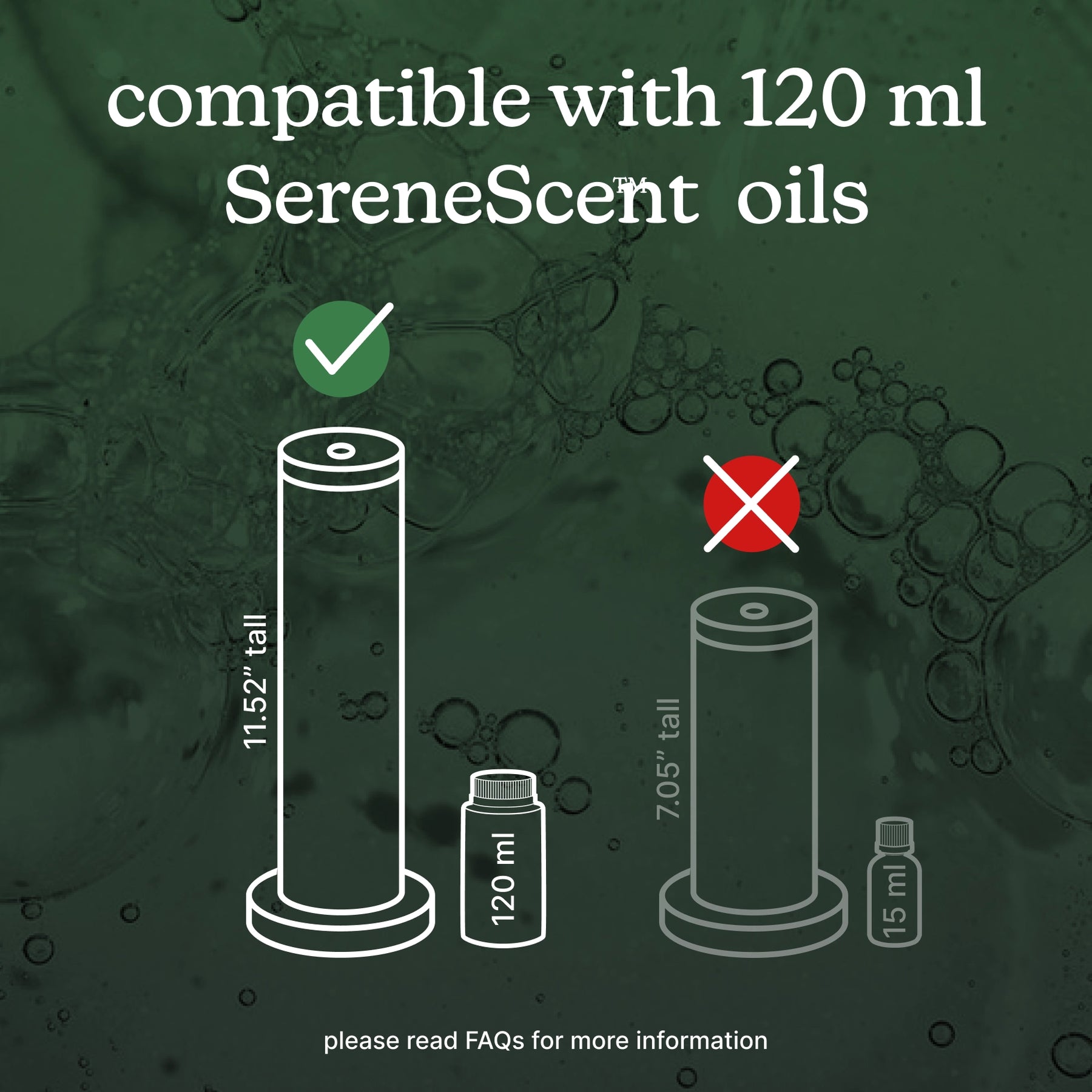 SereneScent 120 ml oil lasts up to 30 days.* *15 or 30 days of operation at 8 hours per day and middle intensity level 2.Your diffuser will only work properly when using SereneScent oils. Use of any other oil is not recommended and will void diffuser warranty.