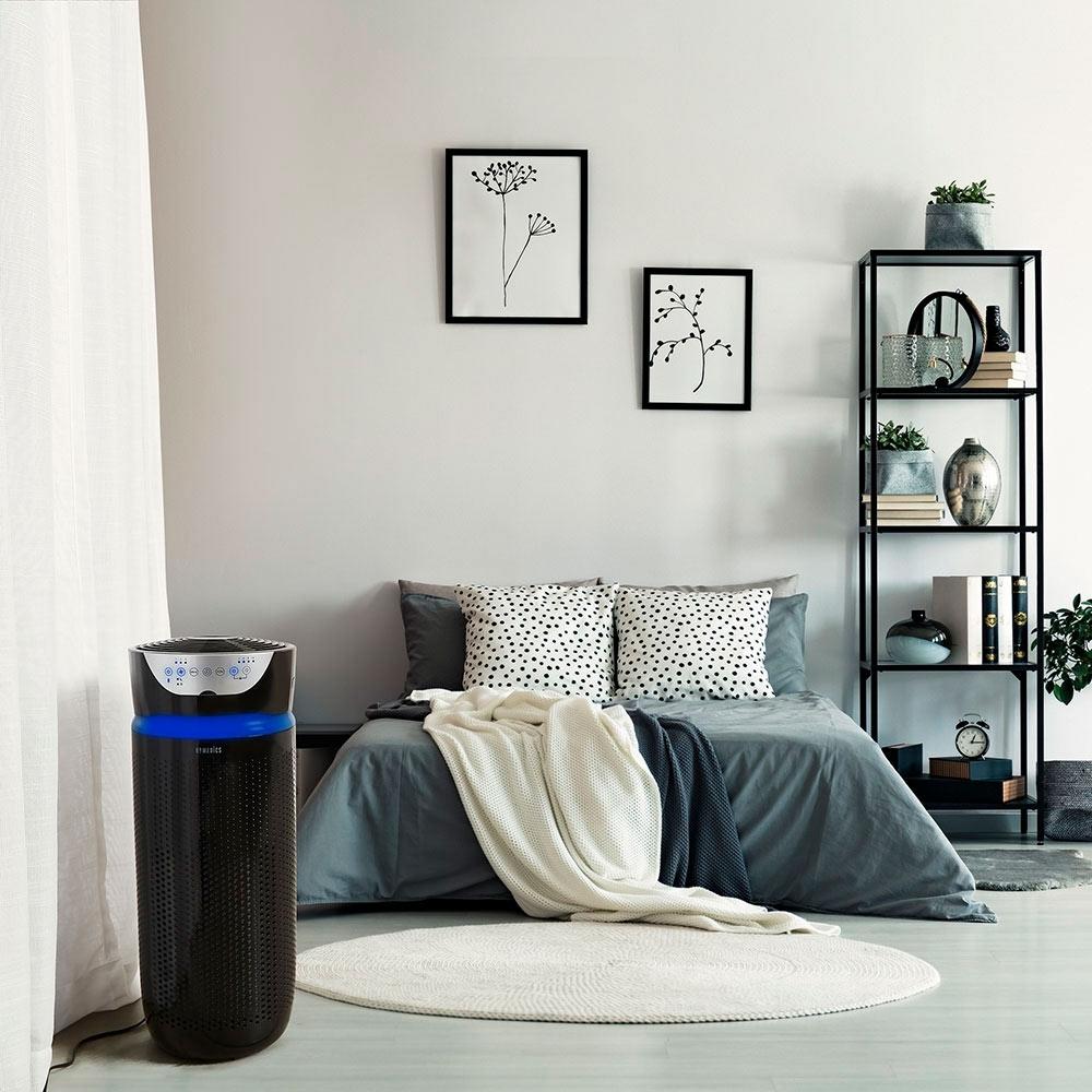 Black | A black Homedics TotalClean 5-in-1 UV-C Deluxe Large Room Air Purifier sits in bedroom