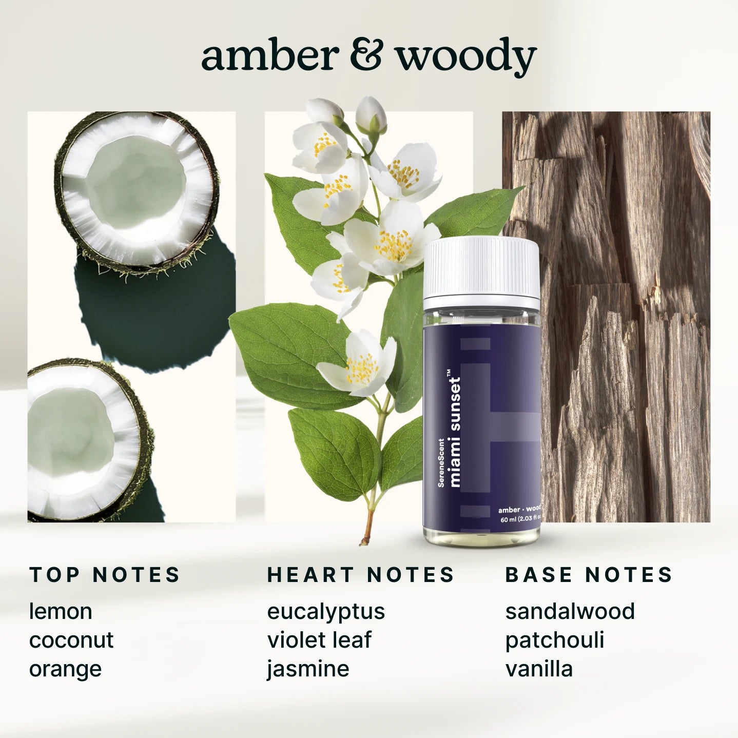 Product packaging with floral elements and color swatches labeled 'amber & woody'.