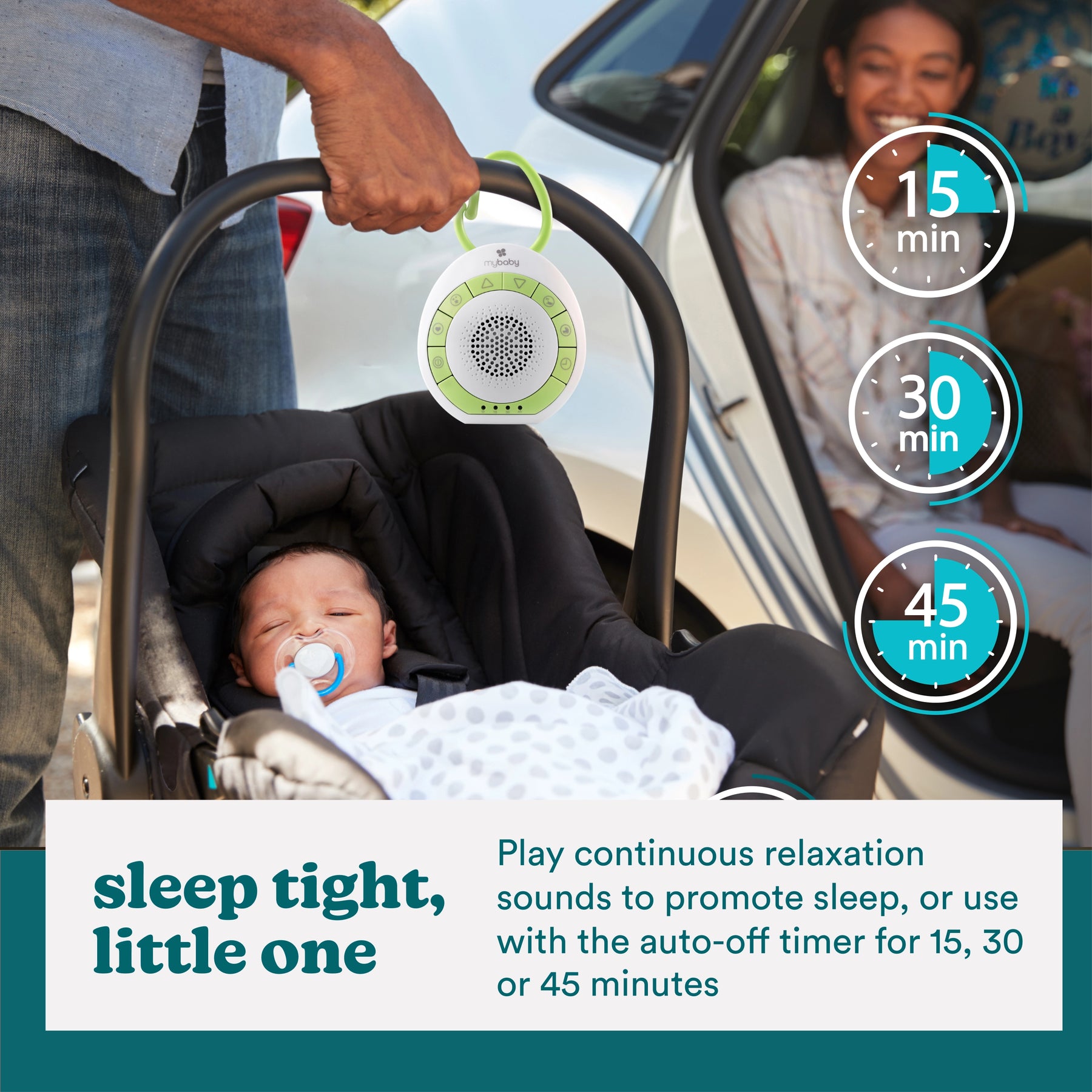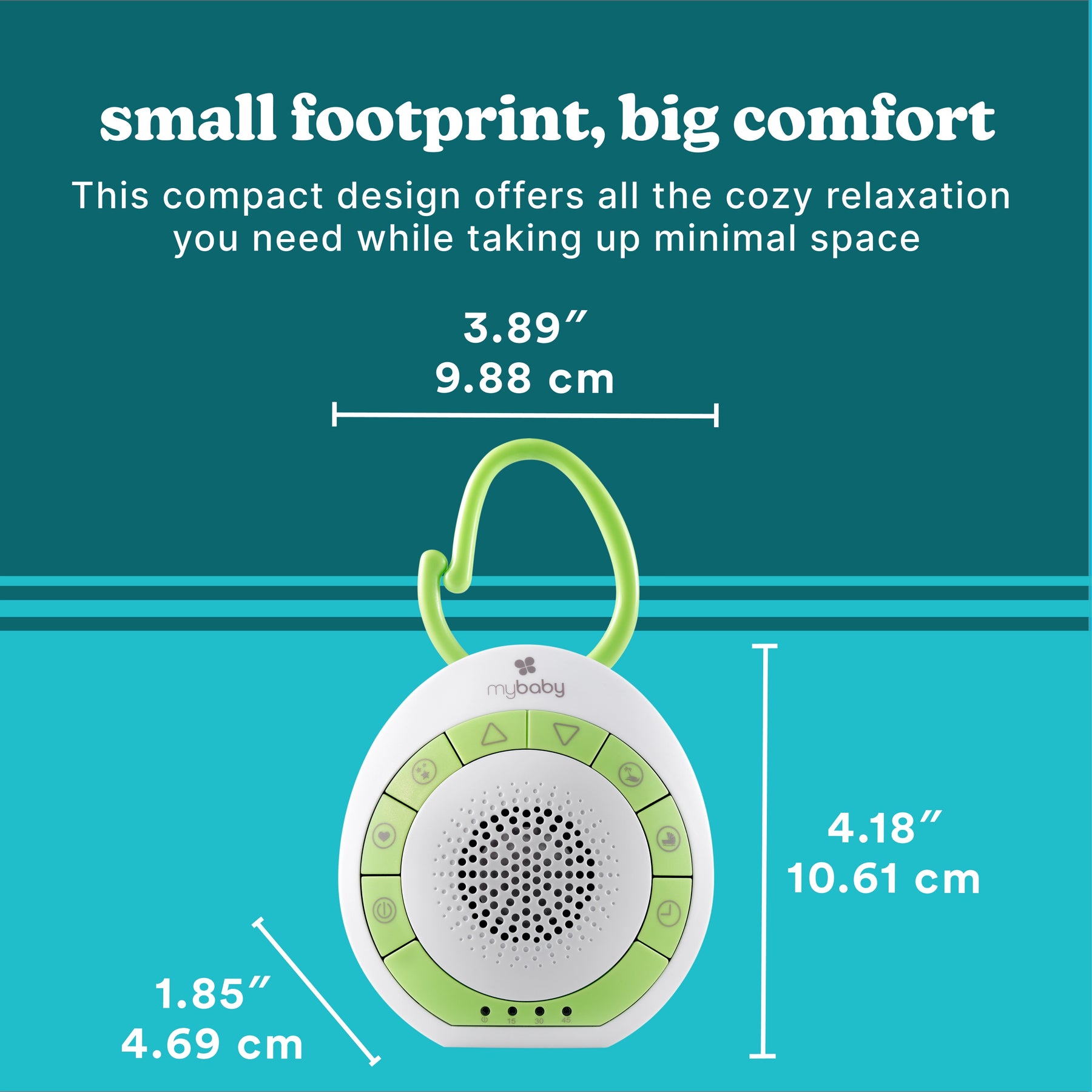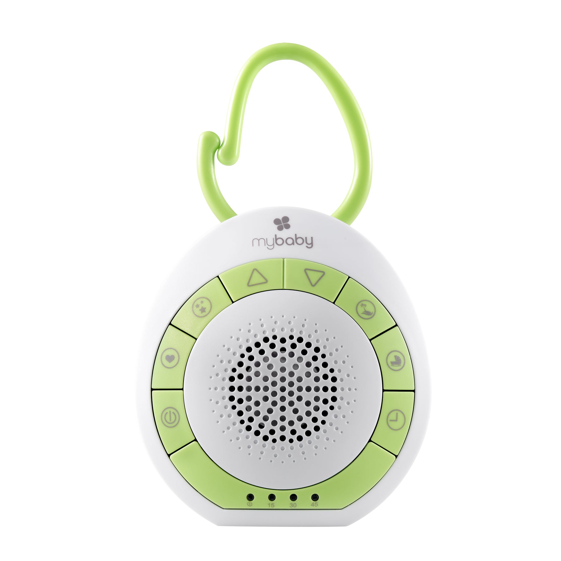 MyBaby Soundspa On-the-Go is a must-have for busy new moms. It plays four different soothing sounds, including Heartbeat, White Noise, Ocean, and Lullaby.