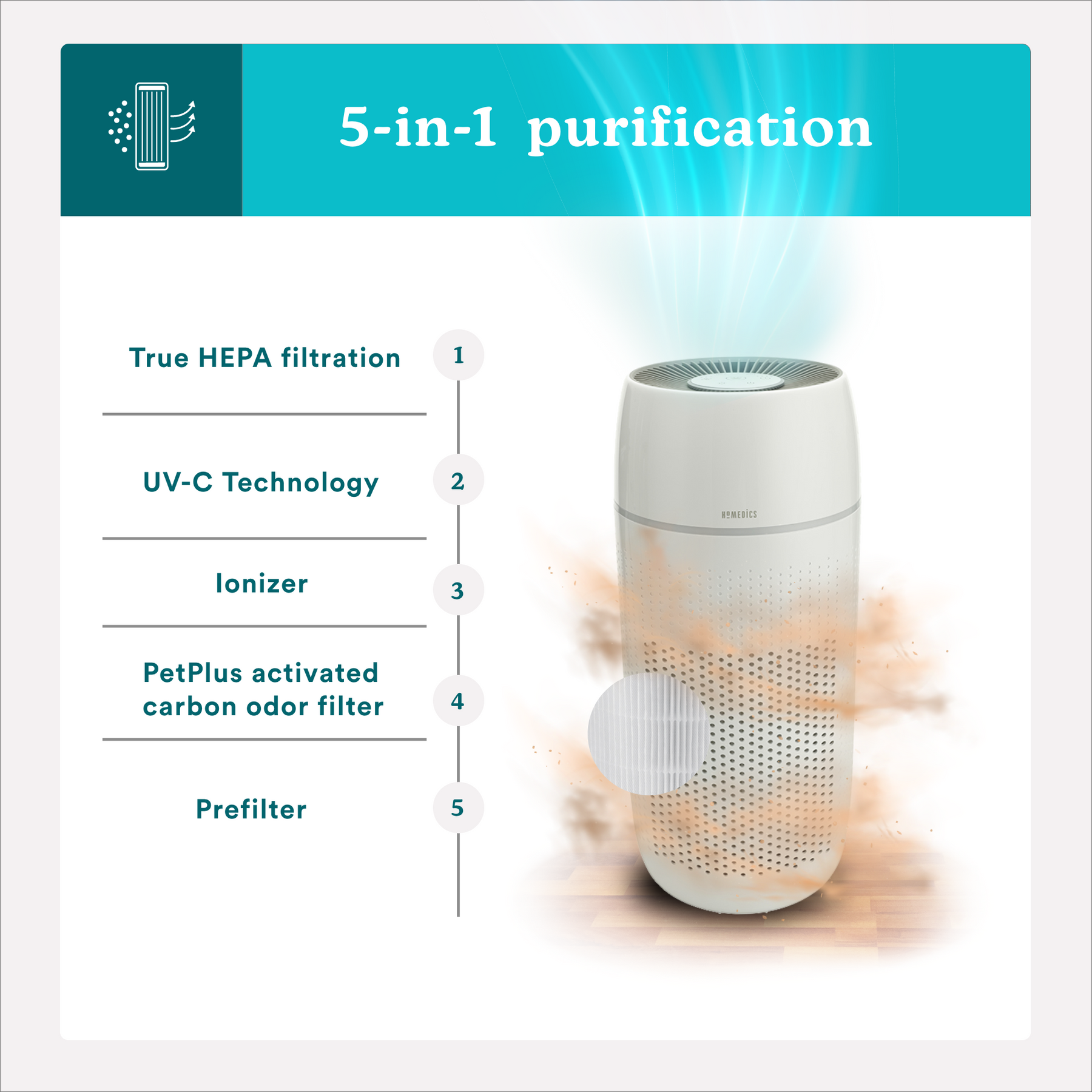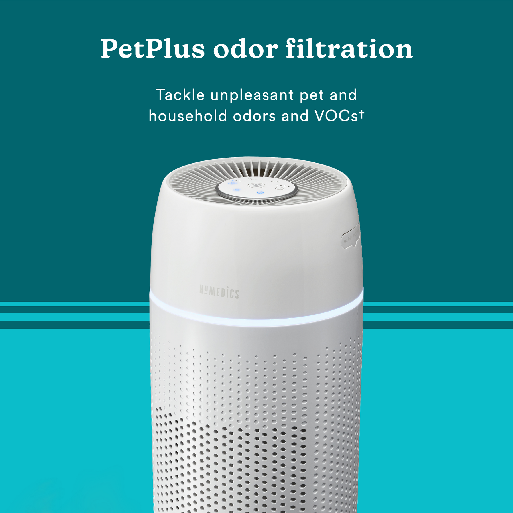Built-in PetPlus activated carbon filter; reduces strong pet odors, household odors, and Volatile Organic Compounds (VOCs)†