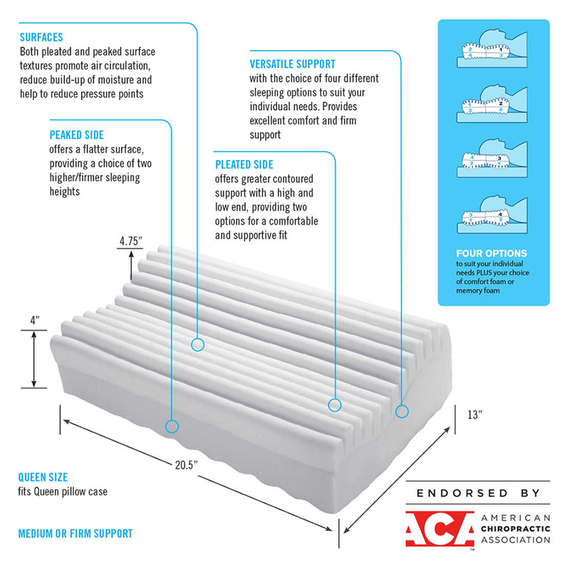 OPTIONS FOR THE BEST SLEEP: Four different pillow sleeping options to suit your individual needs, plus your choice of comfort foam or memory foam