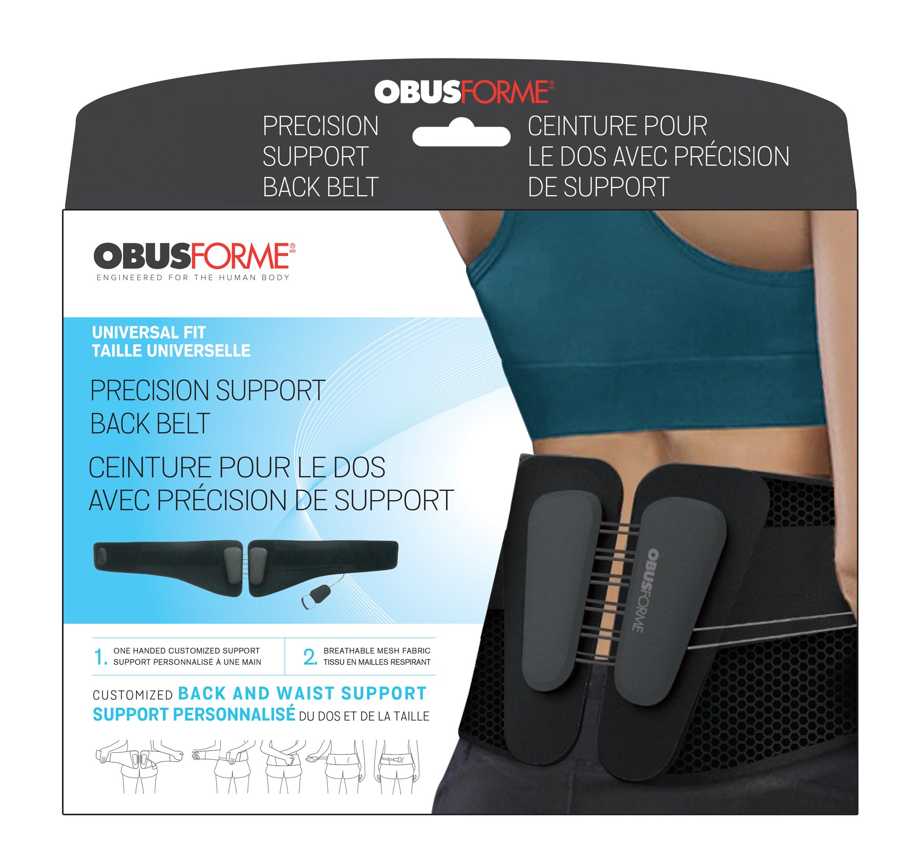 Enhance your performance with the ObusForme Precision Support Back Belt! This belt is strategically designed to support a healthy back and correct posture. It's an ideal companion for activities that involve lifting, pushing, pulling, walking, exercising, and repeated bending or twisting. The belt's breathable fly-knit fabric ensures you remain cool and comfortable. Provides a universal fit and comes with an extender belt to ensure the perfect size for everyone.