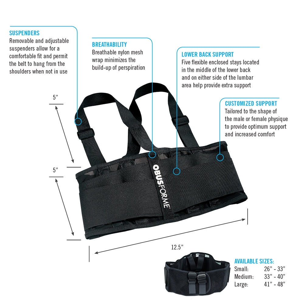 Discover enhanced back and lumbar support that comes when you use the ObusForme Unisex Belt. This unique versatile design has an adjustable fit that fastens with Velcro and includes removable suspenders providing extra support where you need it most. And don't worry about discomfort from sweat, the belt's breathable mesh wrap ensures you stay supported as you bend, twist, and carry in any setting.