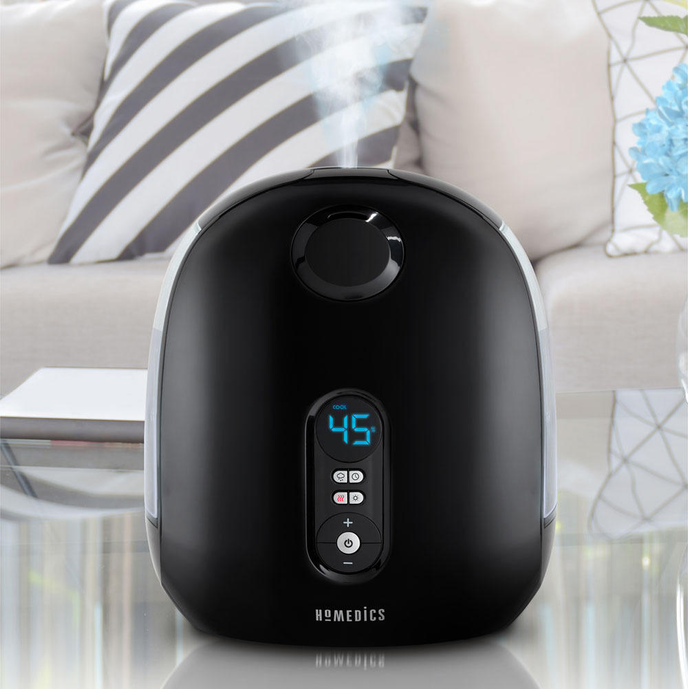 The Homedics TotalComfort Deluxe Ultrasonic Humidifier produces a visible warm or cool mist for up to 120 hours of runtime.